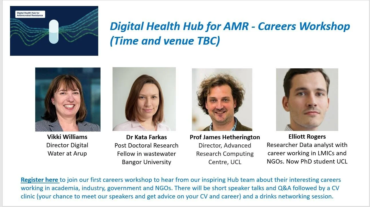 We are currently planning our first Digital Health Hub for AMR Careers Event, involving 4 speakers from our Hub discussing their career paths, and the event will also involve a CV clinic. The speakers at the event include: Vikki Williams (ARUP), Prof James Hetherington (ARC, UCL), Dr Kata Farkas (Post doctoral researcher, Bangor University) and Elliott Rogers (PhD student, UCL)